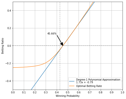 최적 베팅 비율은 closed form으로 구하기 힘들기 때문에, 미리 한 번 계산한 뒤에 다항식 근사 함수를 이용하면 좀더 계산이 빠를 수 있다. 위 그래프에서 실제로 1차함수로 근사한 결과식을 구했는데, 전적이 도박 특성상 최소 도박 성공 확률은 43%, 아무리 증가하더라도 60% 이상 되기는 어렵기 때문에 $0.43<p<0.6$ 구간에 대해서 least square error를 가지는 직선이다. 이 직선의 기울기는 1.73, x절편은 0.4566 인데, 다시 말해 도박 성공 확률이 약 45.7% 를 초과할 경우 해당 초과분의 약 1.7배만큼의 비율로 베팅을 하는 것이 최적 베팅 비율이다. 예를 들어 현재 보유 금액이 100만원이고 도박 성공 확률이 48%라면 45.7%의 초과분 2.3%p의 1.7배인 3.91%의 비율인 39100원을 배팅하는게 가장 이득이다. 이보다 적게 베팅하거나 많게 베팅할 경우 상대적으로 손해를 본다.